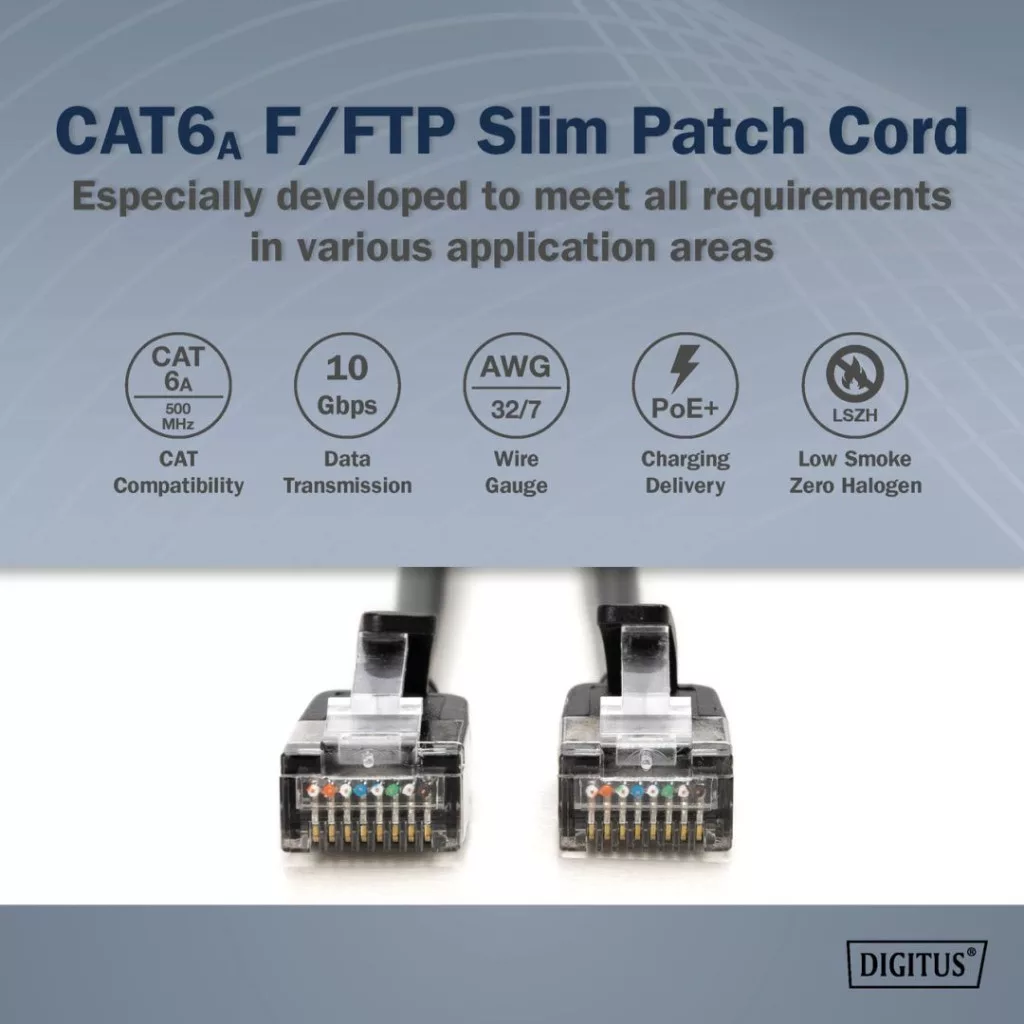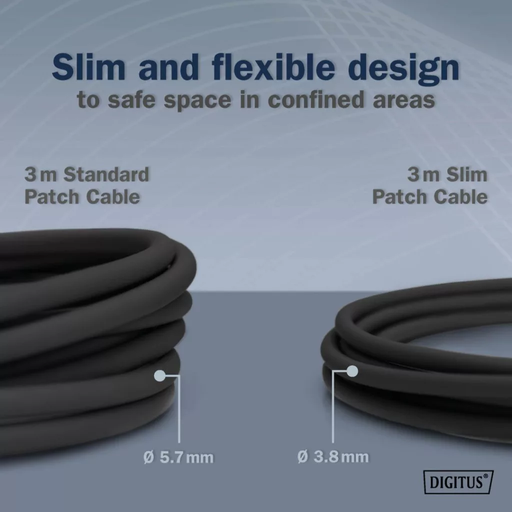 A DIGITUS® Slim patch kábeleket kis külső átmérőjük és rugalmas köpenyük jellemzi. A vékony kialakítás sokoldalú felhasználást tesz lehetővé a hálózatban. A DIGITUS® Slim patchkábelek emellett az ISO/IEC 11801 és a DIN EN 50173 CAT 6A szabványoknak megfelelően készülnek. Garantálják, hogy a kábelszerelés megfelel az ISO és EN csatornaspecifikációnak, és kiváló teljesítményt nyújtanak a DIGITUS® CAT 6A kábelezésben. A teljesítményt 500 MHz-ig tesztelték, beleértve az olyan jellemzőket is, mint a közeli keresztbeszólás ("NEXT"). A DIGITUS® patch kábeleket kifejezetten úgy fejlesztették ki, hogy megfeleljenek a különböző alkalmazási területek összes követelményének. Mindegyik kábelt húzáscsökkentővel ellátott, öntött gyűrődésgátló hüvelynel látták el. Ezenkívül a hüvelyben van egy reteszelőkar-védelem, amely megakadályozza, hogy a kábel elgörbüljön, és a reteszelőkar letörjön a dugóról.