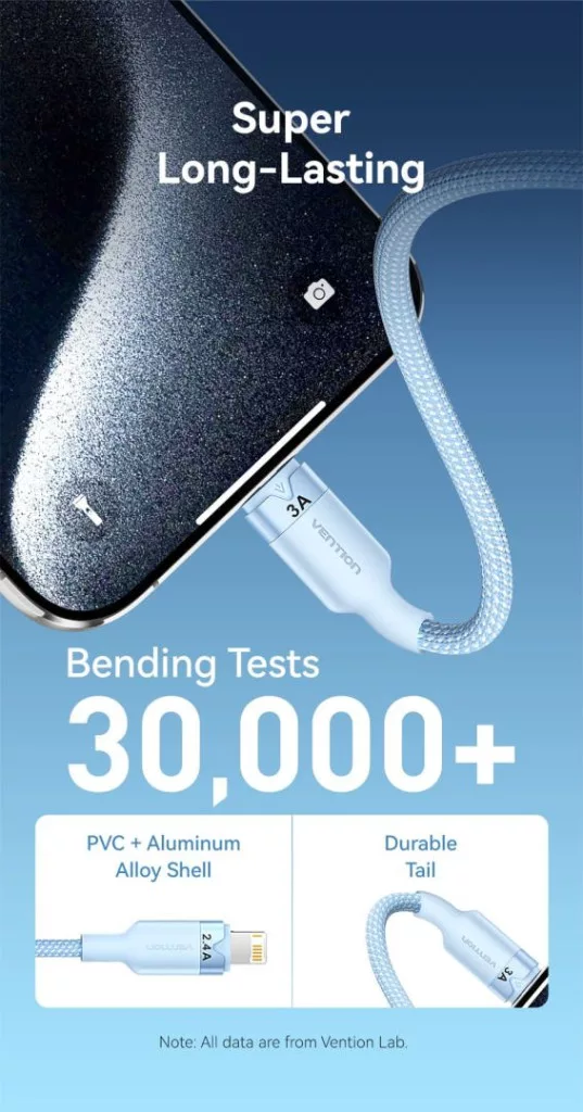A Vention kábel egyik fő előnye a robusztus kialakítás. A PVC és a pamutfonat biztosítja a kopásállóságot, a megerősített végek pedig megvédik a kábelt a sérülésektől még erős igénybevétel esetén is. Ennek eredményeként a kábel ellenáll a hajlításnak és a kopásnak, amit a több mint 30 000 hajlítással végzett tartóssági tesztek is megerősítenek.