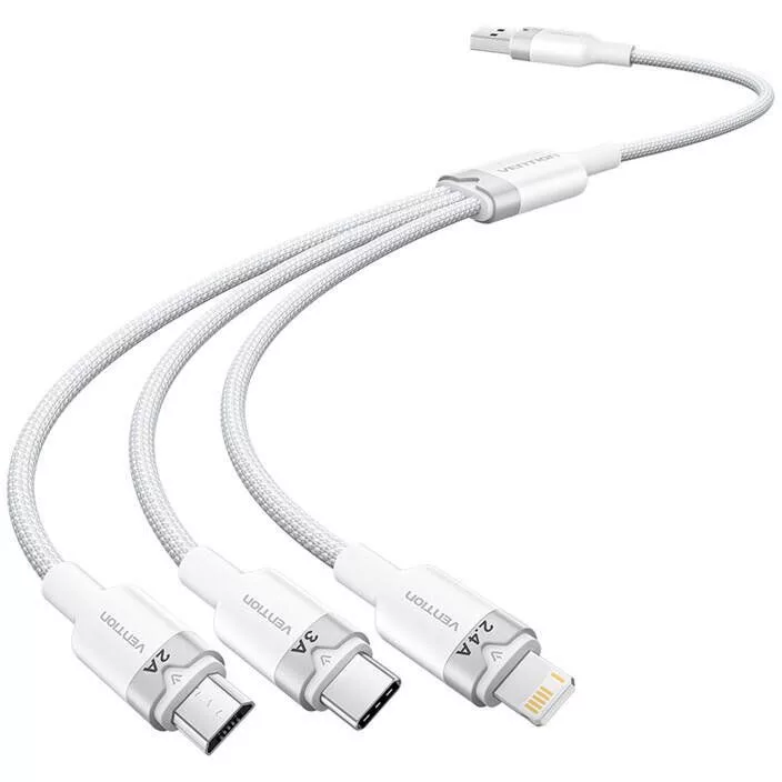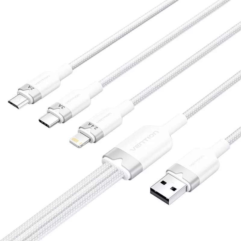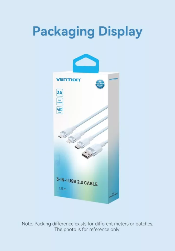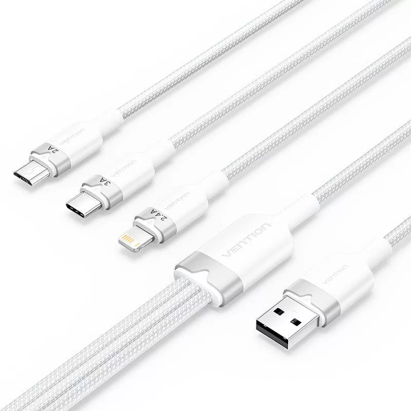 Az USB 2.0 A - 3in1 3A Vention CTPLG 1,5M kábel egy sokoldalú megoldás, amely lehetővé teszi, hogy különböző eszközöket töltsön és szinkronizáljon egyetlen kábellel. Három különböző csatlakozóval - Lightning, USB-C és Micro-B - felszerelve tökéletes lesz a modern okostelefonok, valamint a régebbi eszközök, például powerbanks és fényképezőgépek töltésére.