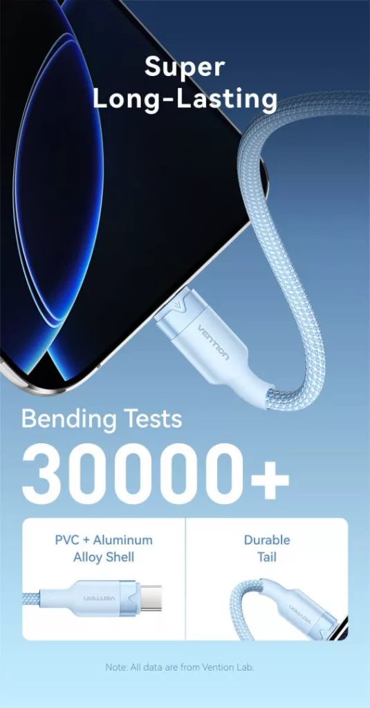 Páratlan tartósság. A Vention kábelt több mint 30 000 hajlítással tesztelték, ami garantálja hosszú élettartamát még intenzív használat mellett is. A megerősített kábel és a nagy teherbírású csatlakozók ellenállóvá teszik a kábelt a töréssel és a sérülésekkel szemben, így ideális választás azok számára, akiknek megbízható tartozékokra van szükségük.