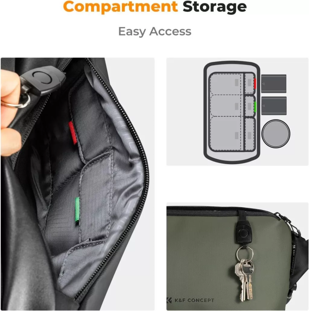 【Jól szervezett rekesz】A K&F Concept Alpha Camera Sling Bag akár 3 rétegű rekeszekkel rendelkezik, amelyek külön-külön tarthatják a fényképezőgépeket, a tartozékokat és a személyes tárgyakat. Tiszta, jól szervezett és könnyű hozzáférés az egyes tárgyakhoz.
