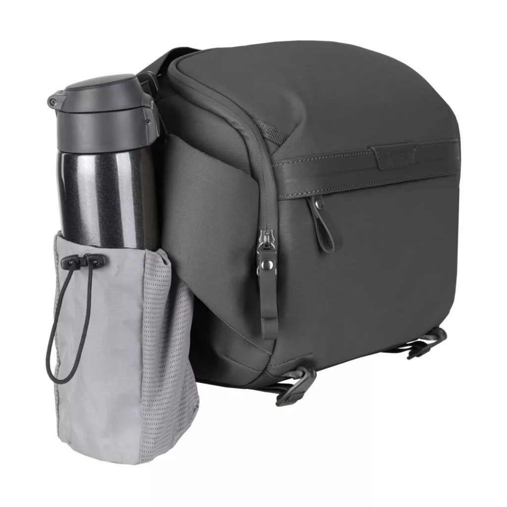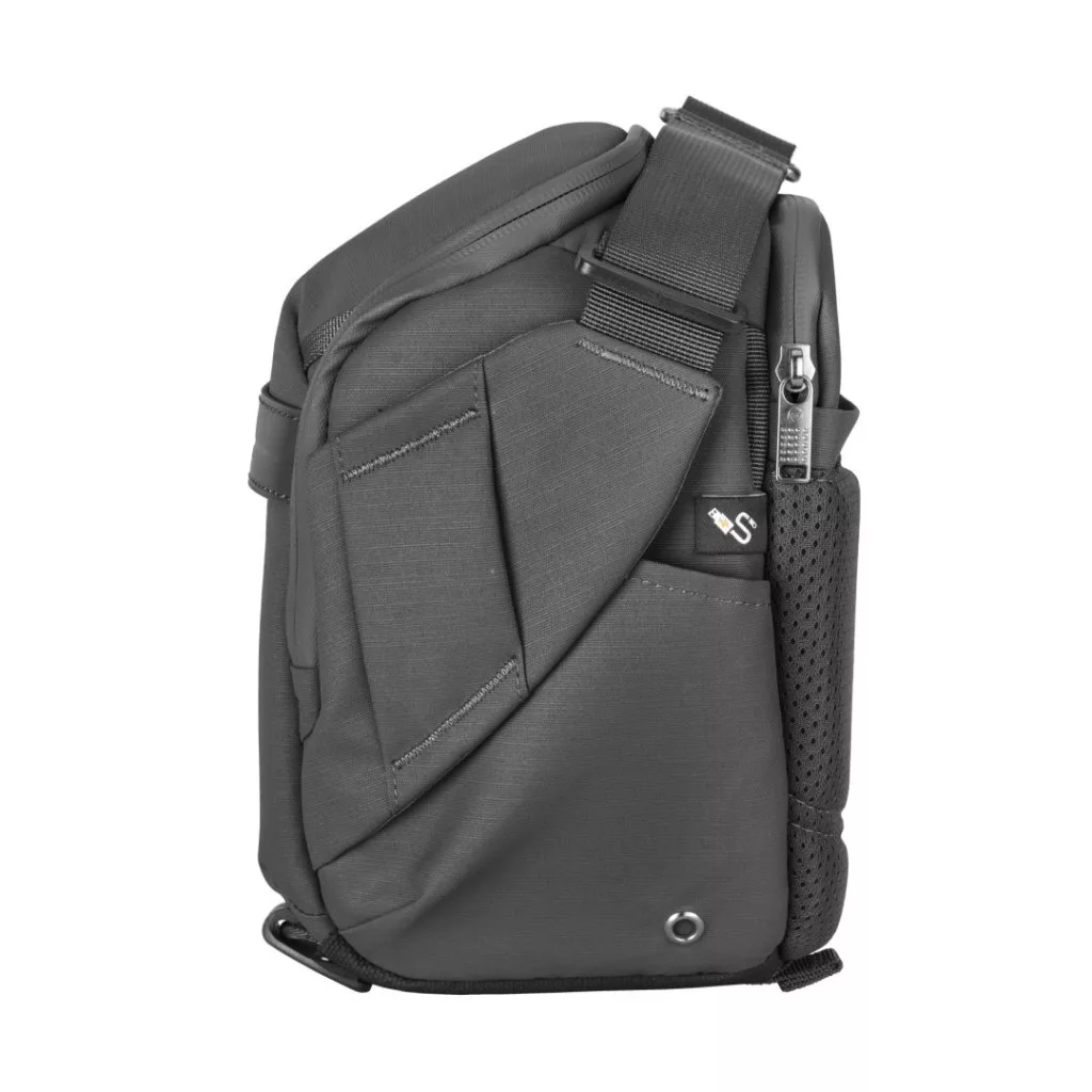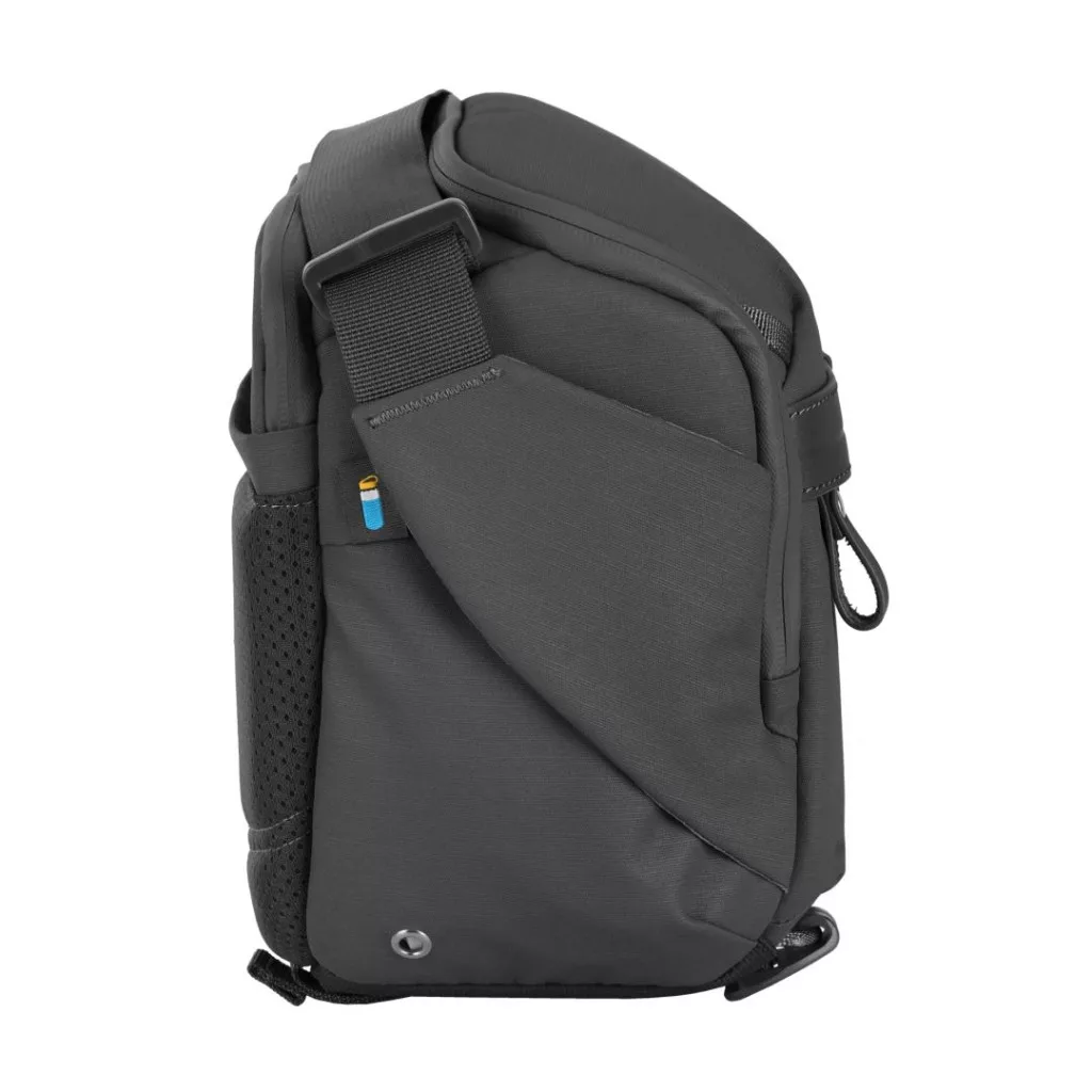 Ez a praktikusan felszerelt válltáska több tárolózsebet is tartalmaz. A bal oldalon (ahogy a táska feléd néz) egy vizespalack zseb van elrejtve. Ezenkívül a felső patent belső oldalán található zárt zsebek tökéletesek SD-kártyák és kiegészítők számára, míg a felső patent külső oldalán és a válltáska elején található zárt zsebek egyéb tárgyak számára használhatók. Van egy rejtett intelligens nyomkövető zseb is, így könnyen megtalálhatja táskáját, ha elkeveredne.