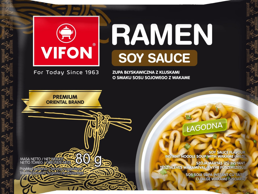 Összetevők: tészta (92,1%): BÚZALISZT, pálmazsír, tápióka, módosított keményítő, só, stabilizátor: trifoszfátok, guargumi, térfogatnövelő szer: kálium-karbonát, nátrium-karbonát, színezék: riboflavinok, leves alap (7,9%): só, ízfokozók: nátrium glutamát,dinátrium-guanilát, dinátrium-inozinát; cukor, SZÓJA mártás por (6,4%): SZÓJA mártás (zsírtalanított SZÓJABAB, BÚZA,só), burgonya keményítő, tápióka, só; hidrolizált SZÓJAfehérje, texturált SZÓJAfehérje, szárított wakame (Undaria pinnatifida) (3,2%), növényi tejpor (glükóz szirup, pálmazsír, stabilizátor: E 340, E 451; kazeinátok (TEJ), emulgeálószer: E 471, E 472; csomósodást gátló anyag: E 551), őrölt bors, szárított shiitake gomba (Lentinus edodes) (2,5%), szalmagomba (Volvariella volvacea) (2,5%), szárított zöldhagyma (KÉNDIOXID és SZULFÁTOK) (2,5%), hagymapor, fokhagyamapor, színezékek: karamell, paprika kivonat, csomósodást gátló anyag: E 551, maltodextrin, SZEZÁM olaj, aromák.