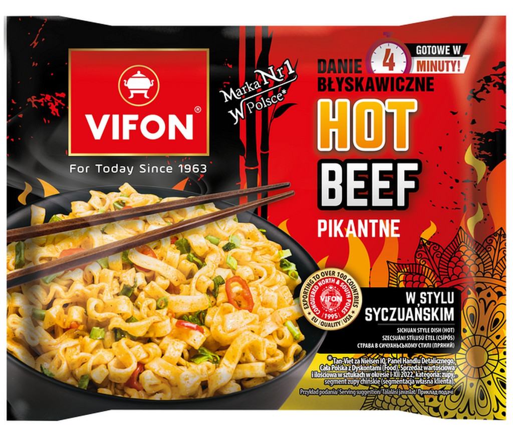 Összetevők: tészta (72,8%): BÚZAliszt, pálmazsír, keményítő, só, cukor, térfogatnövelő szerek: kálium-karbonátok, nátrium-karbonátok; stabilizátorok: cellulózgumi, guargumi; kurkuma, színezék: riboflavinok; szósz (26,7%): víz, finomított pálmaolaj, cukor, sózott SZÓJA (SZÓJA, cukor, víz, só, módosított keményítő, savanyúságot szabályozó anyag: E 330, tartósítószer: E 202), só, fűszerkeverék (3,3%) (szecsuáni bors, chili, gyömbér, fokhagyma), módosított keményítő, rizsecet, ízfokozók: nátrium-glutamát, dinátrium-guanilát, dinátrium-inozinát; SZÓJAszósz koncentrátum (víz, SZÓJAliszt), színezék: paprikakivonat; savanyúságot szabályozó anyag: citromsav; tartósítószerek: kálium-szorbát, nátrium-benzoát; SZEZÁMolaj, aromák, szárított zöldségek (0,5%): chili, metélőhagyma.